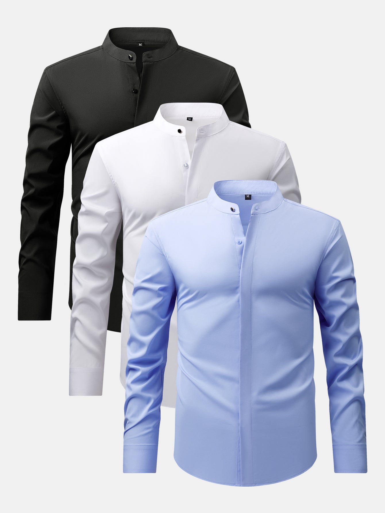 3 Pezzi Camicia da Vestito con Colletto alla Coreana e Patta Nascosta Non Stirabile